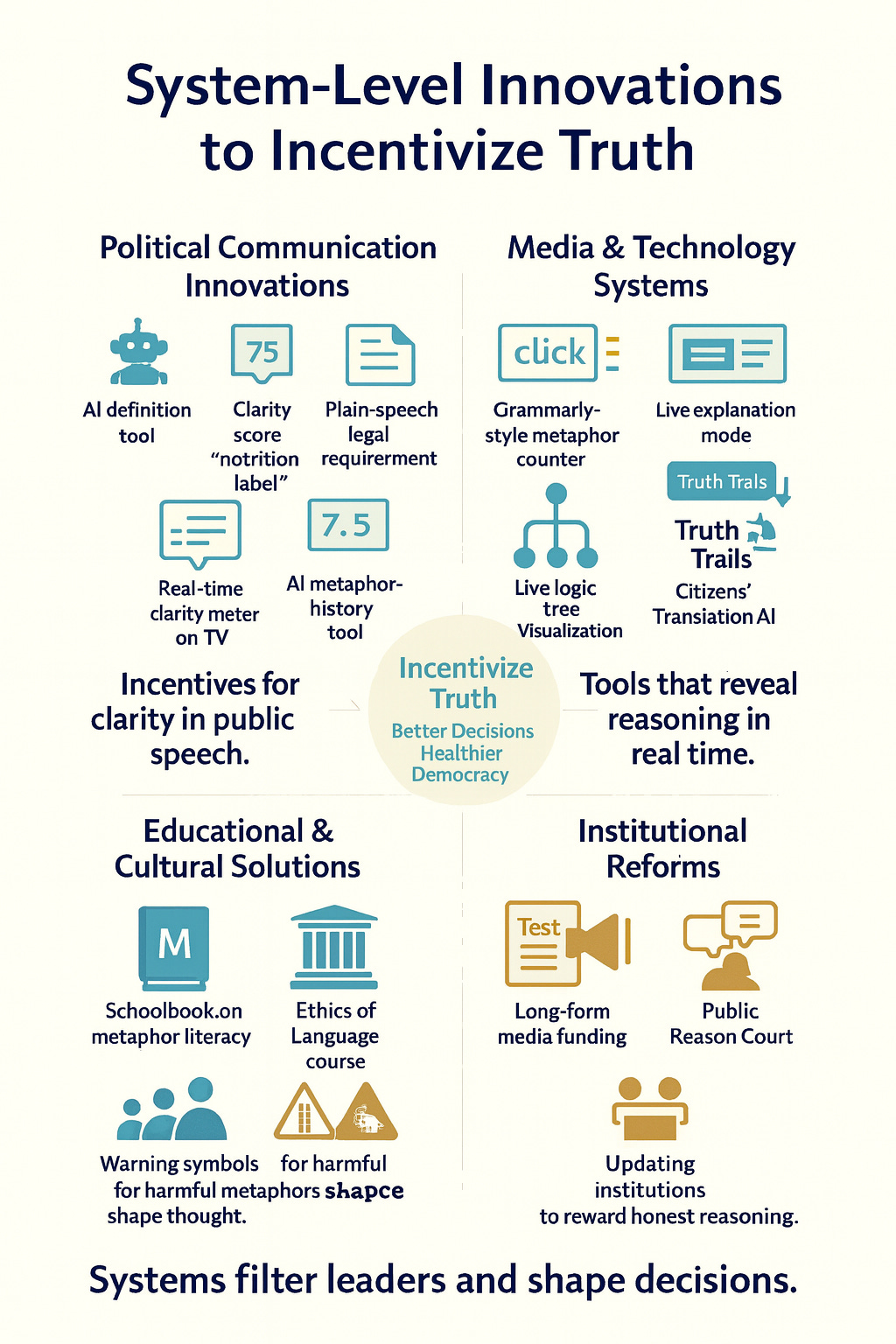 To restore democratic integrity, political systems must create norms and structures that favor long-form reasoning: plain speech, transparent definitions, and the explicit articulation of a metaphor’s limits. Citizens are capable of understanding complexity when given space and honesty, and leaders have an ethical duty to provide that clarity.