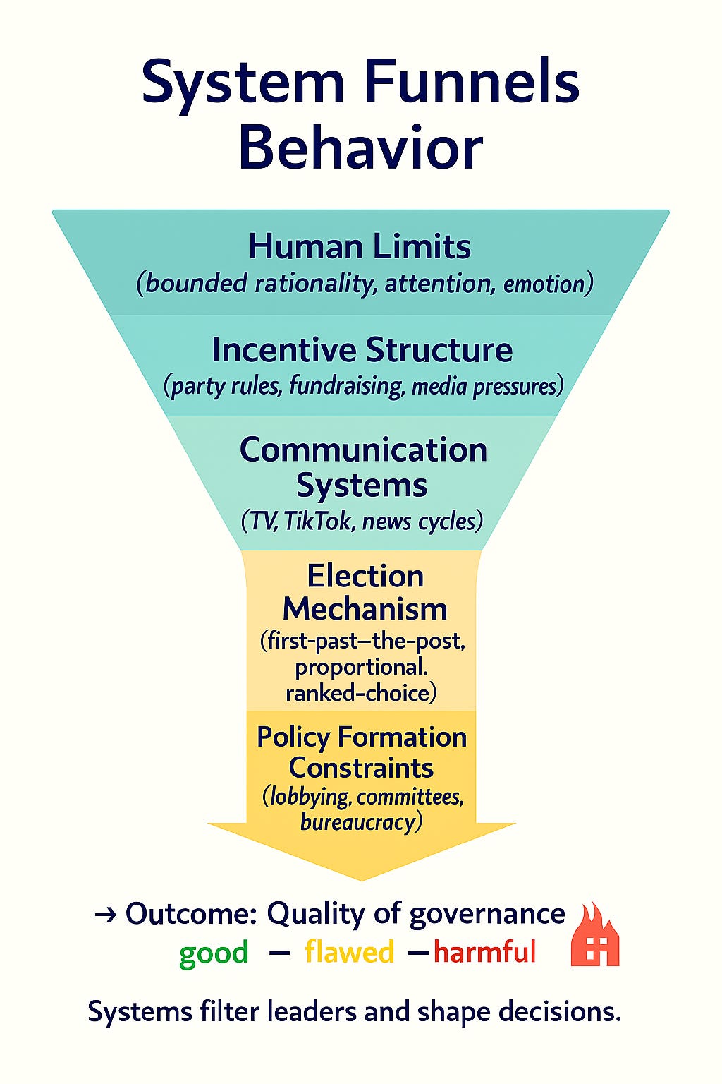 Because people have limits. We all do. We can’t expect politicians to be perfectly rational any more than we expect it of ourselves. Instead, we should look at the systems around them—the rules they play under, the incentives they respond to, the way messages must be shaped, and the channels through which they speak. These systems invite certain types of leaders to step forward, shape the messages they use, and even color the decisions they make once in office.
